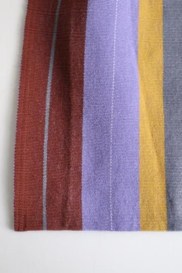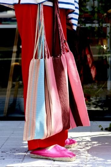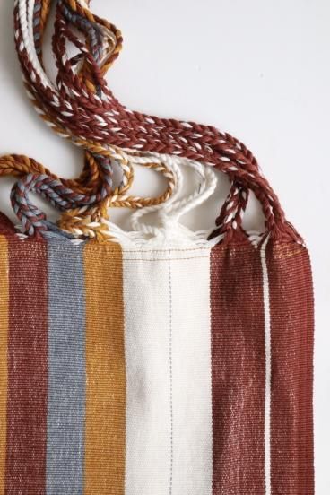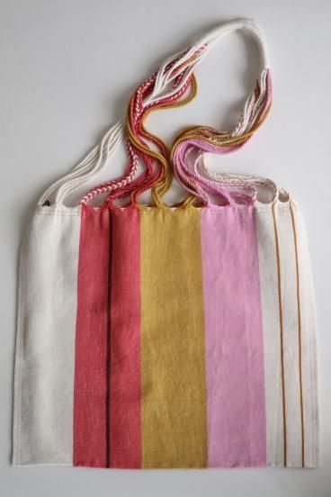 織り機の原点ともいえる、最もシンプルで原始的な織り機で丁寧に織られたハンモック状のコットンバッグ。ハンドルは生地を織る際、縦糸を長く残し、1本1本の縦糸を手作業で撚ることで形成されています。