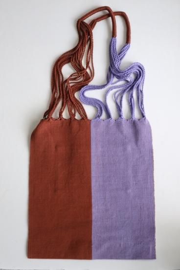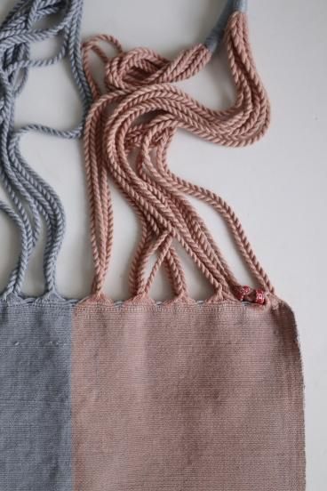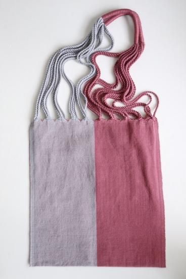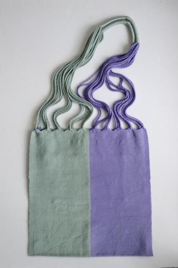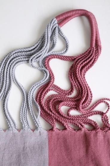 織り機の原点ともいえる、最もシンプルで原始的な織り機で丁寧に織られたハンモック状のコットンバッグ。ハンドルは生地を織る際、縦糸を長く残し、1本1本の縦糸を手作業で撚ることで形成されています。