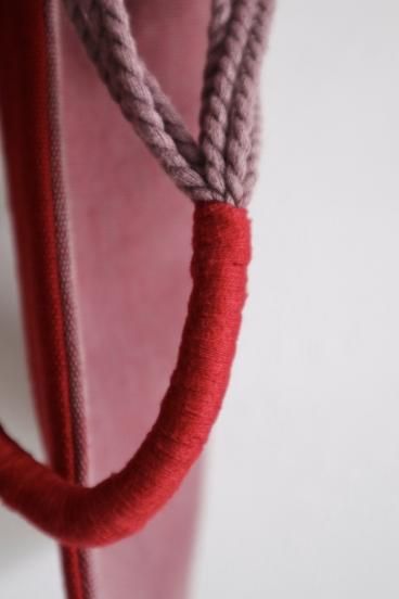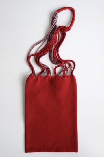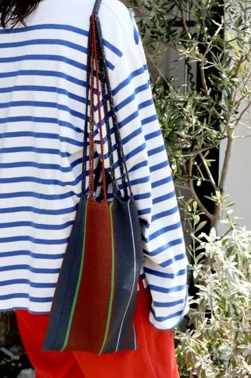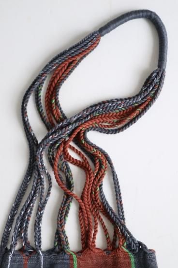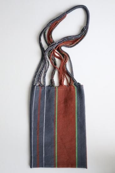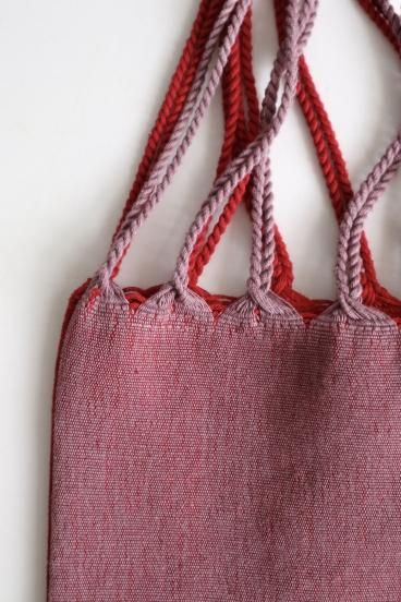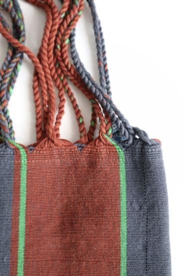織り機の原点ともいえる、最もシンプルで原始的な織り機で丁寧に織られたハンモック状のコットンバッグ。ハンドルは生地を織る際、縦糸を長く残し、1本1本の縦糸を手作業で撚ることで形成されています。