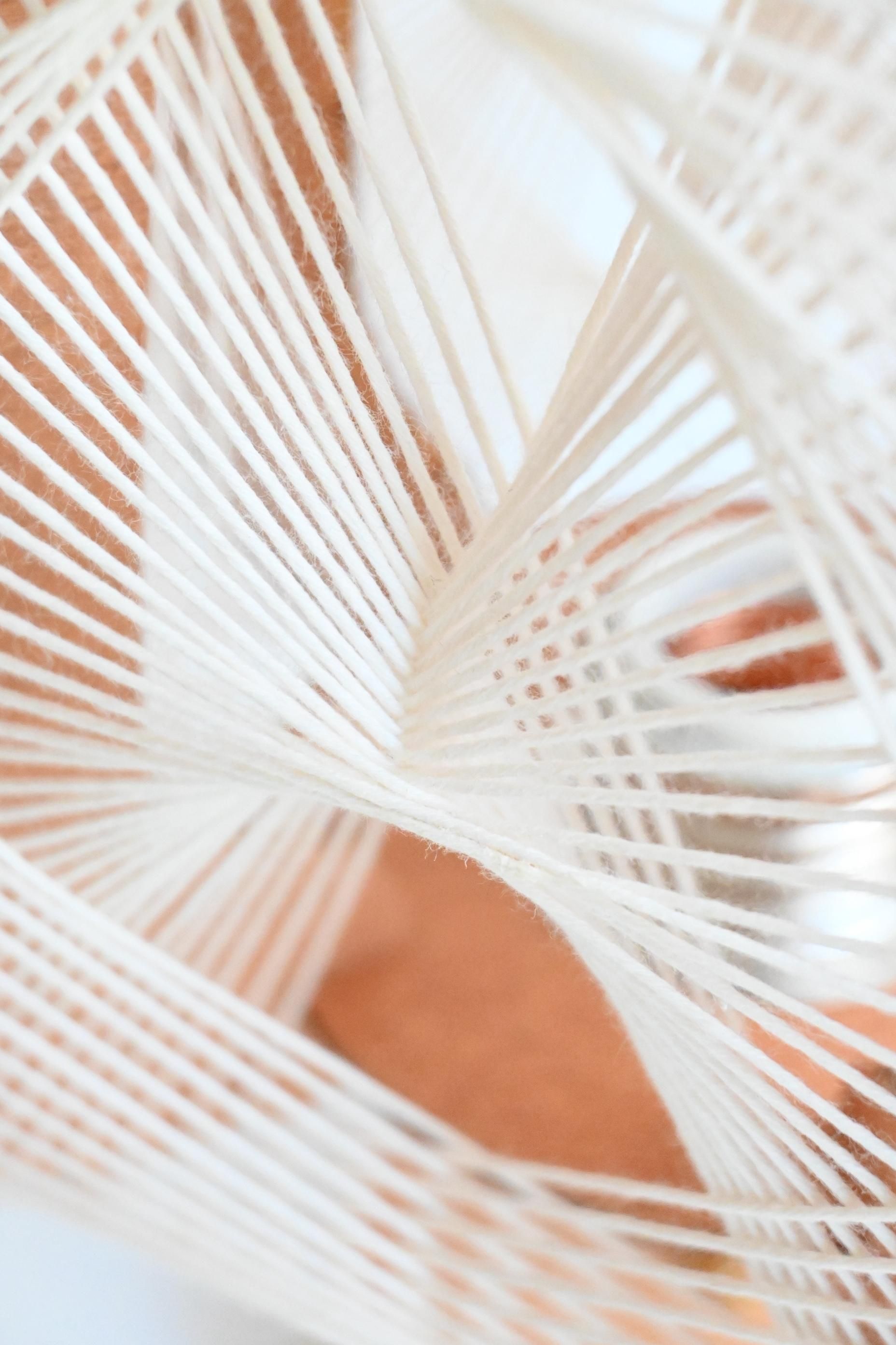 複雑な幾何学模様のような糸の配列パターンが特徴的なデザイン。
