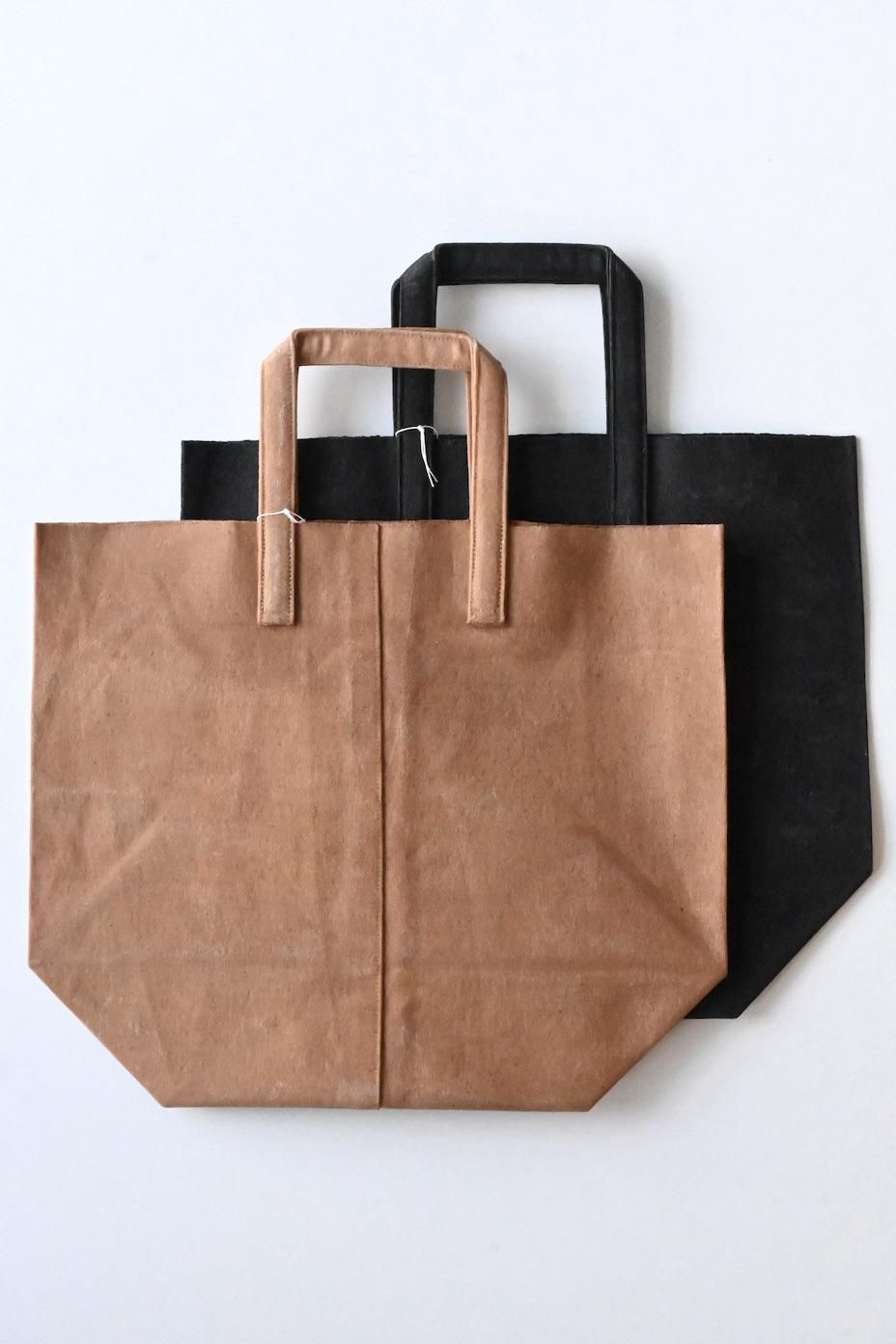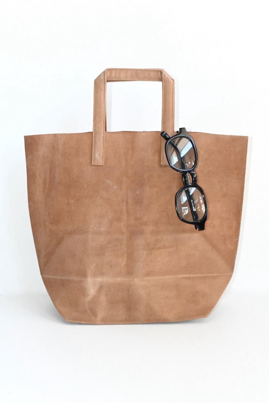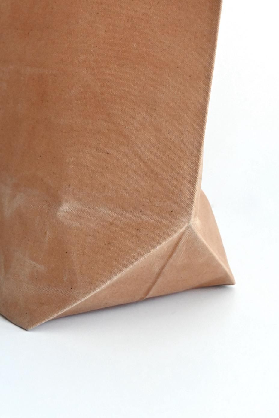 紙袋の質感を再現するために、下染めをした帆布にコーヒーや紅茶などで染色し、蝋(ロウ)引き加工が施された瀧川かずみさんのバッグ。