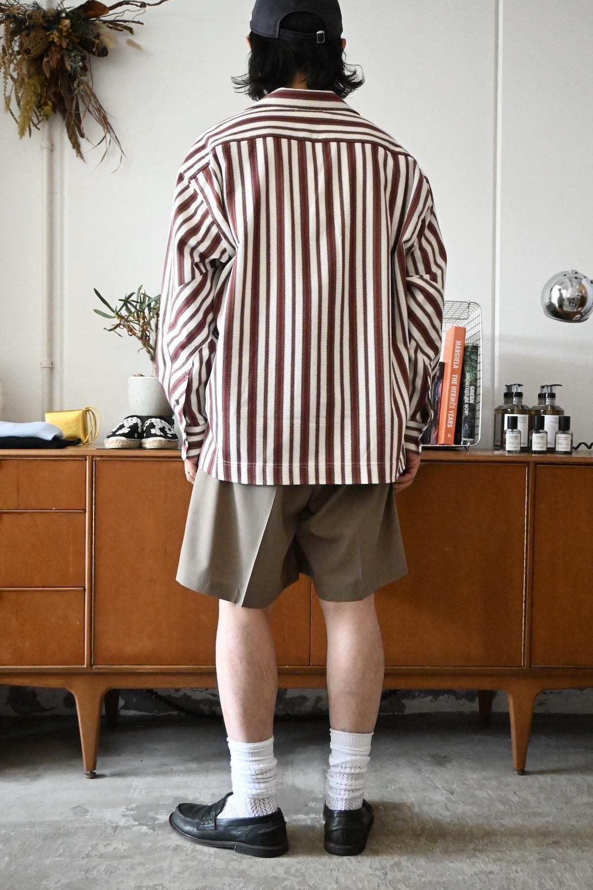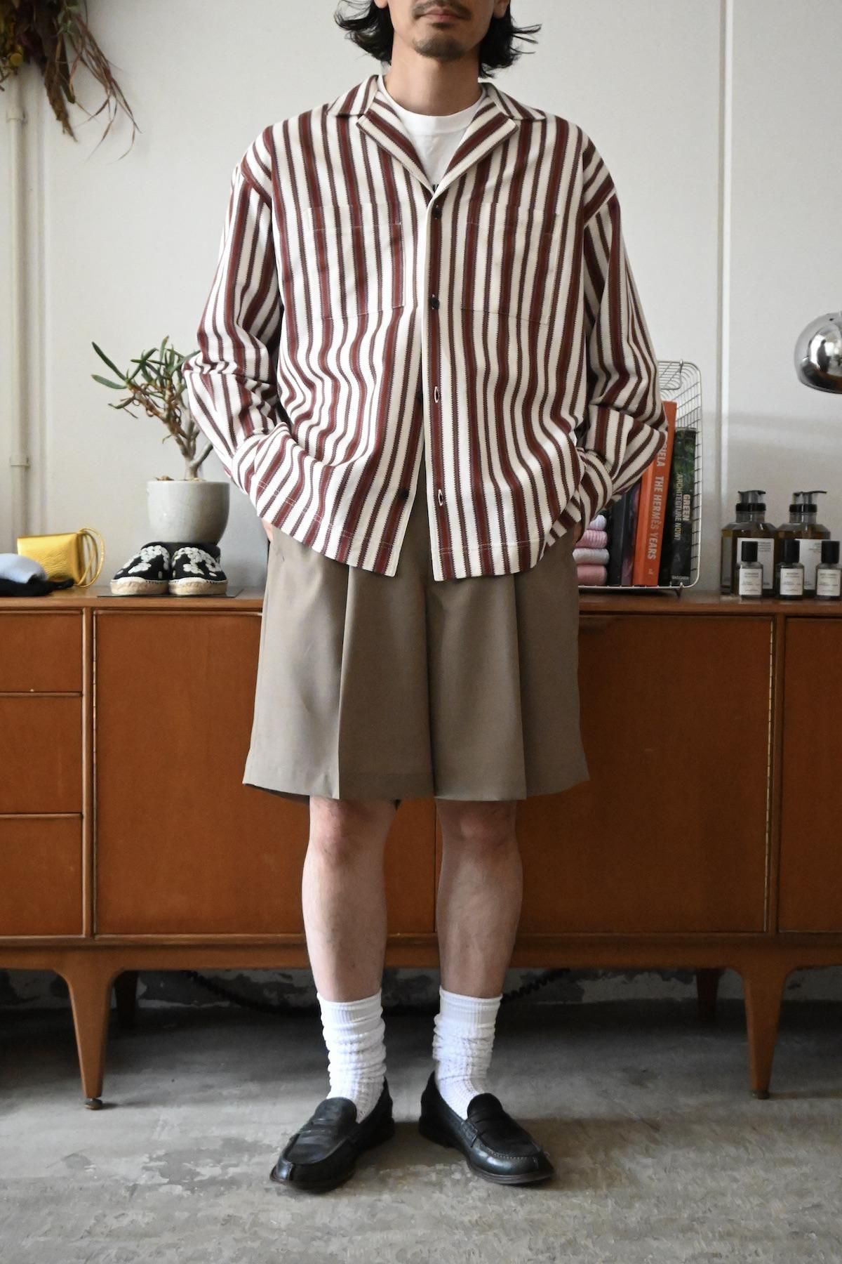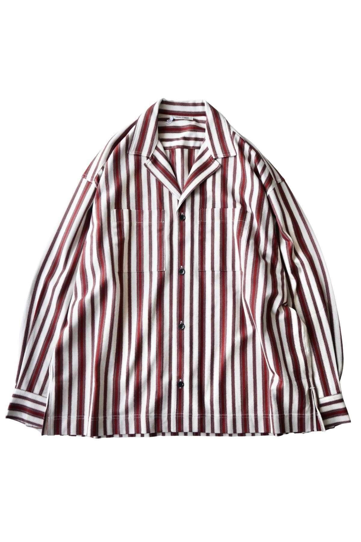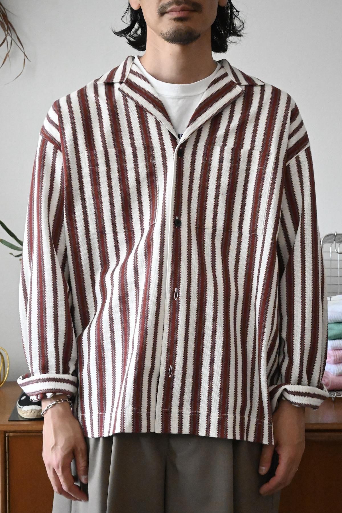 オリジナルマルチストライプのオープンカラーシャツ。
