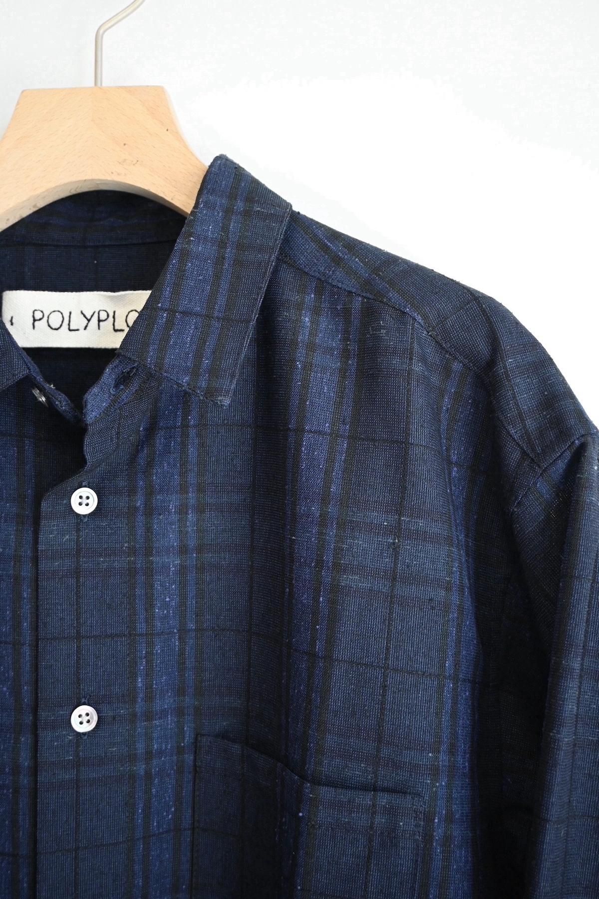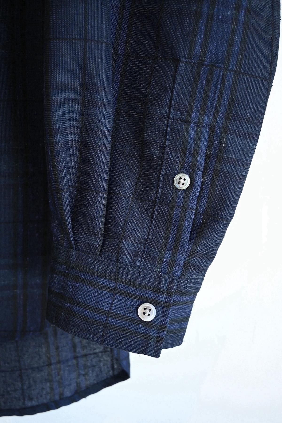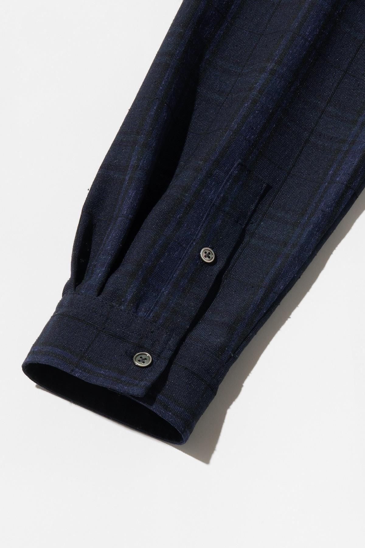 強撚のレーヨンポリエステルに、シルクのネップが入っており、少し凹凸のあるドビー織りの生地が特徴のシャツ。
