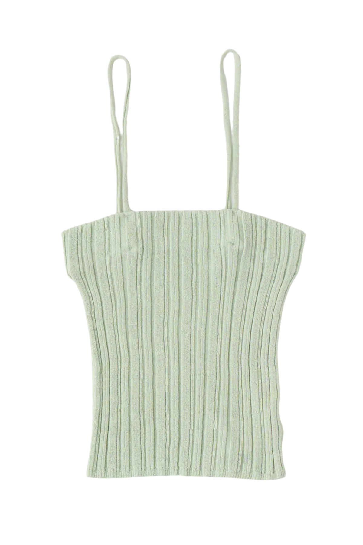 ランダムリブに編んだ肩紐のついたチューブトップです。肩紐は調節可能で、紐を外して着用したり、色々なスタイルを楽しめるアイテムです。同じシリーズのWVFL-UW106とのレイヤードもおすすめです。