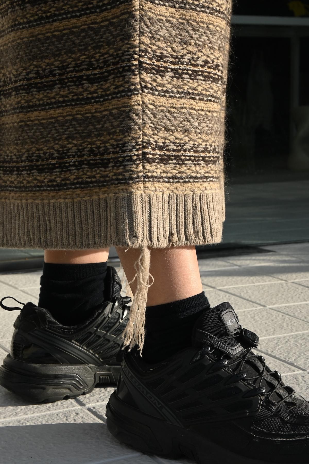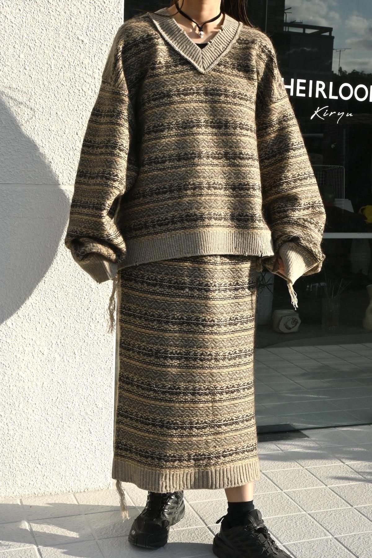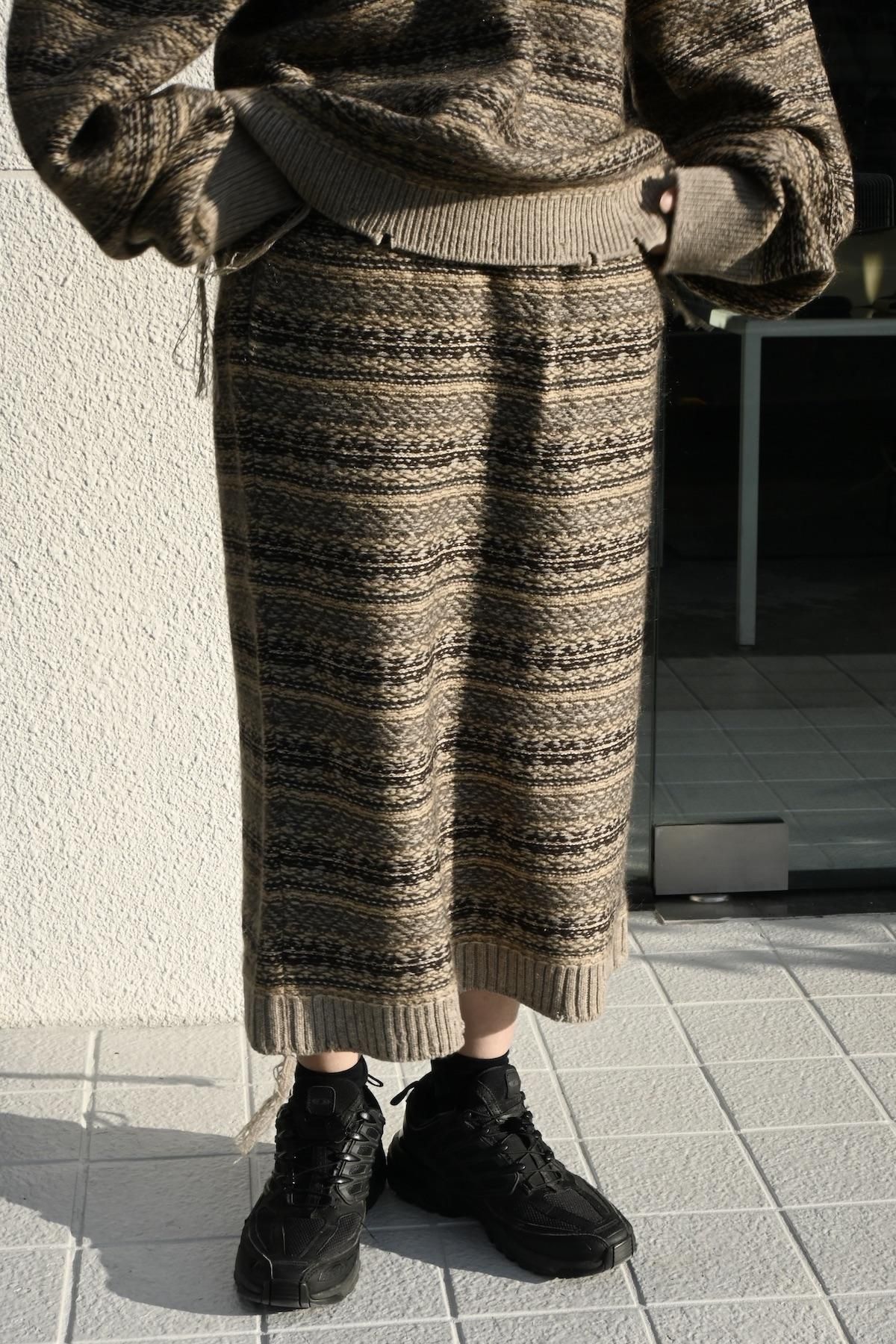 伝統的なフェアアイルニットを裏返したウエストゴム仕様の I ラインスカート。